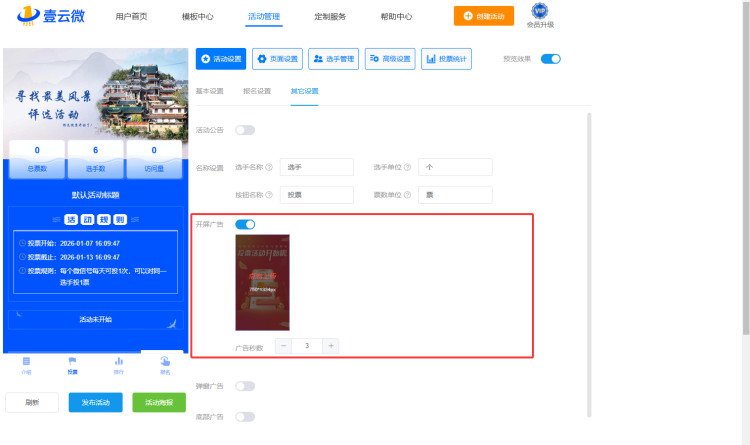 开启【开屏广告】,上传开屏图片,并设置广告秒数