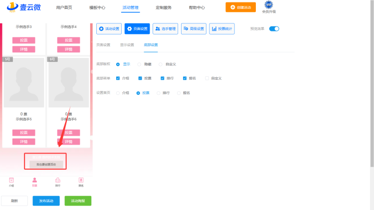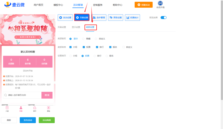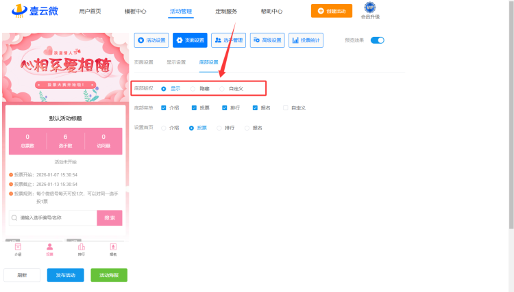 如何设置底部版权? 2023-08-18 18:14:22 阅读次数:1502 本文有:56个字 大约需要阅读时间:1分钟 进入活动编辑后台 点击【页面设置】中的【底部设置】 设置底部版权 具体效果如图所示: 本文标题:如何设置底部版权?