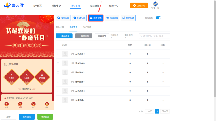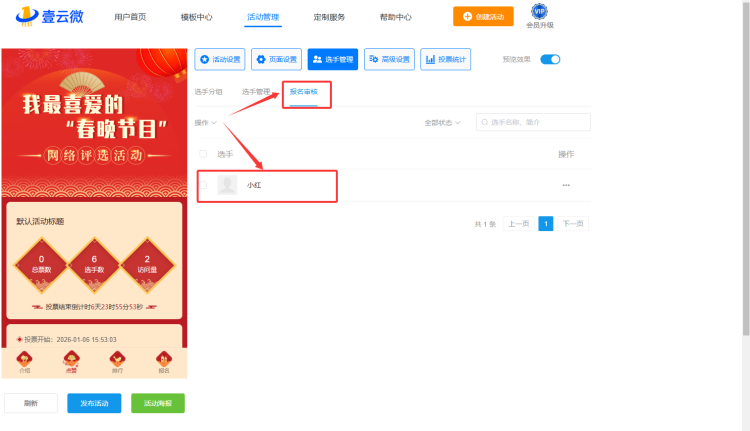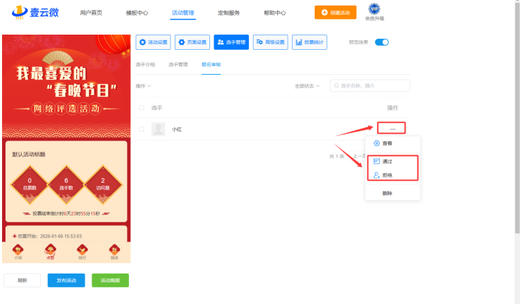 按照以上步骤进行,就可以看到所有报名的选手,查看选手详情后,点击选手右侧的三个小点,可以选择“通过”或者“拒绝”,只有“通过”的选手才可展示在选手列表中。