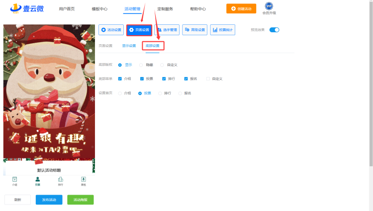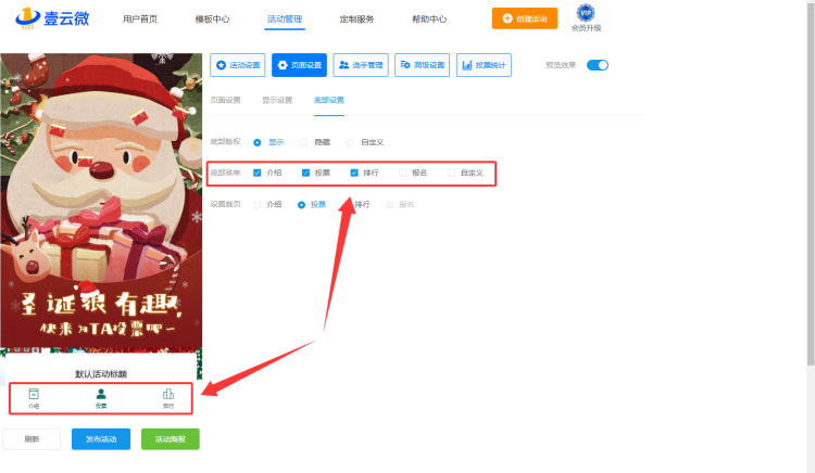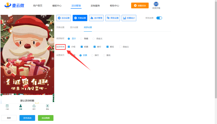 如何隐藏底部菜单栏? 2023-08-18 18:14:22 阅读次数:1618 本文有:75个字 大约需要阅读时间:1分钟 进入活动编辑后台 点击【页面设置】中的【底部设置】 选择【底部菜单】 去掉不需要显示选项的勾选,对应选项便不会在投票页面呈现。 本文标题:如何隐藏底部菜单栏?