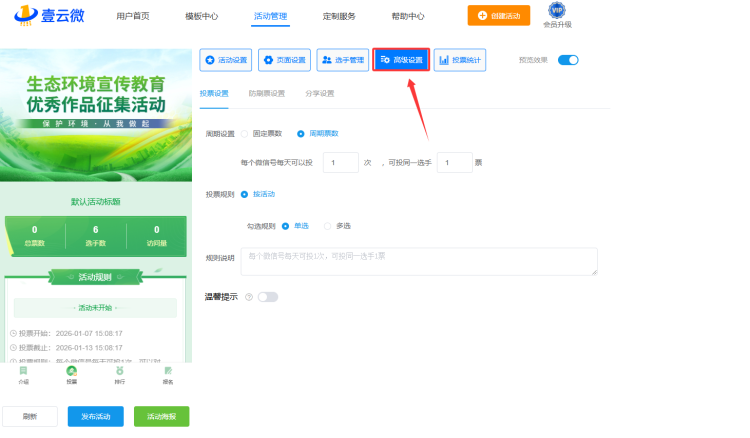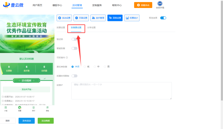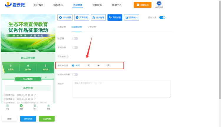 开启黑名单防刷功能,提供低、中、高三个可选档位。不同档位代表对多次参加投票活动微信号的屏蔽灵敏程度,鉴于人工水军的微信号普遍有多次投票参与史,该功能可针对性防范人工刷票。
