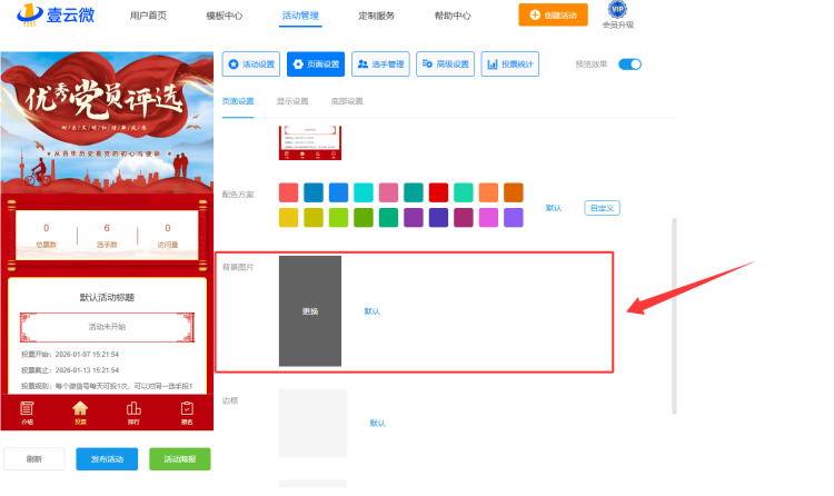 如何更换背景图片? 2026-03-23 15:06:00 阅读次数:267 本文有:33个字 大约需要阅读时间:1分钟 进入活动编辑页面 打开【页面设置】 选择【背景图片】 更换背景图片 本文标题:如何更换背景图片?