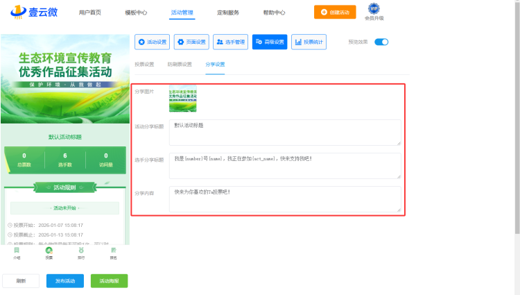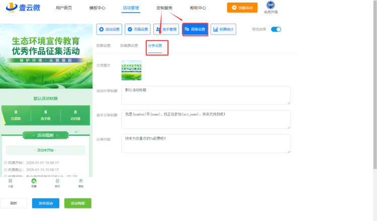 如何编辑分享设置? 2026-03-23 15:28:11 阅读次数:279 本文有:46个字 大约需要阅读时间:1分钟 进入活动管理后台 点击【高级设置】中的【分享设置】 编辑分享图片、活动分享标题、分享内容等。 本文标题:如何编辑分享设置?